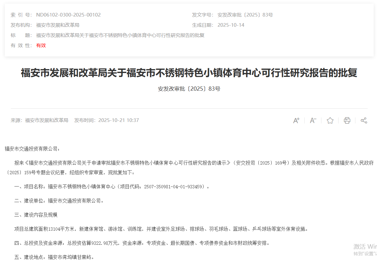 2025年10月14日,福安市发展和改革局就福安市不锈钢特色小镇体育中心可行性研究报告作出批复意见。